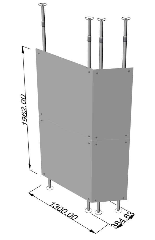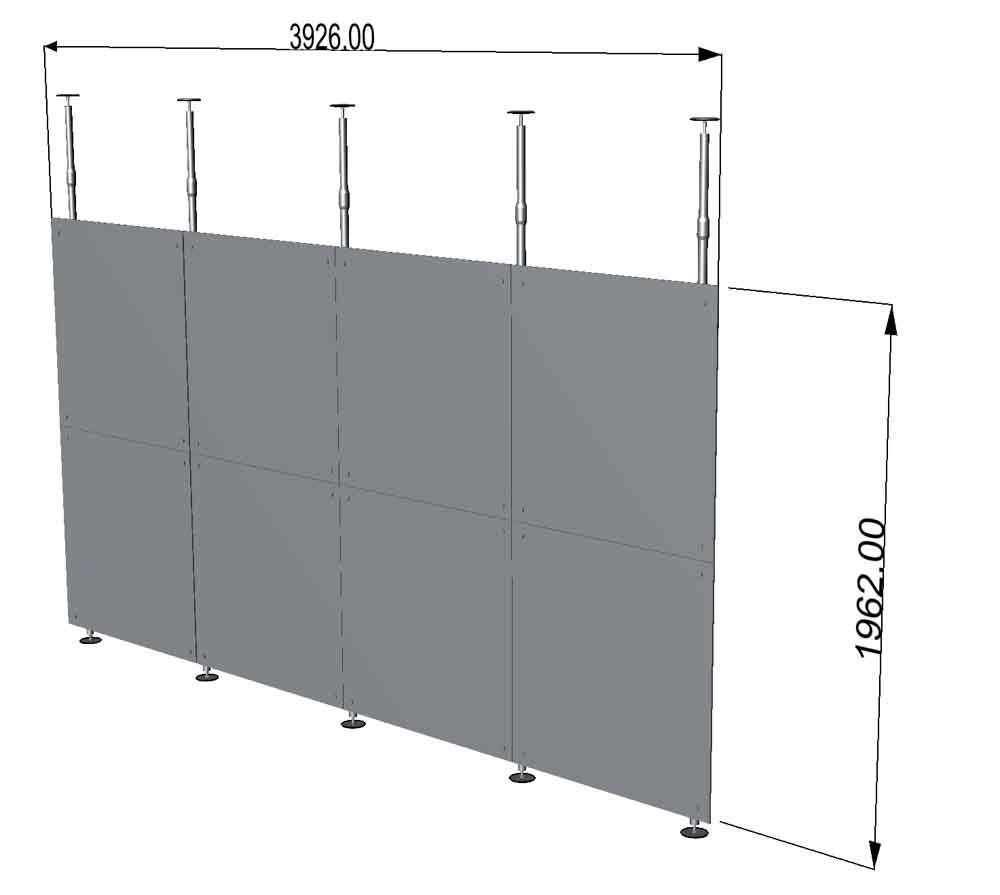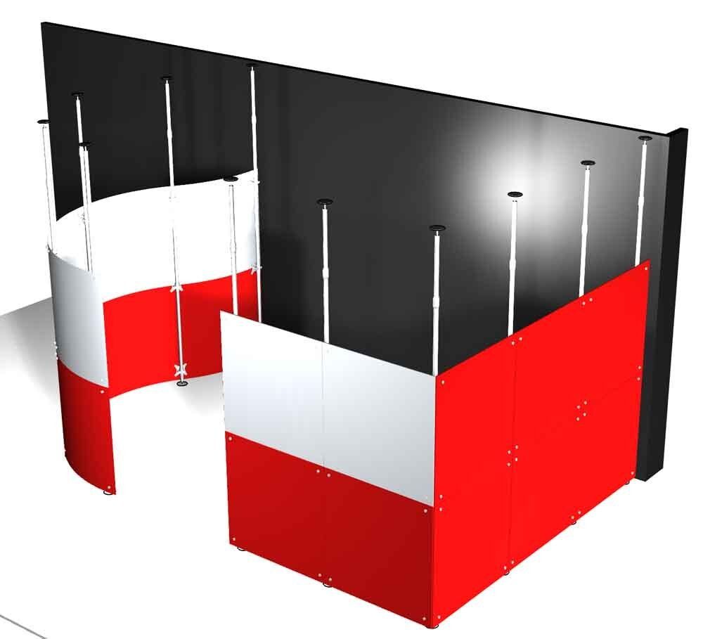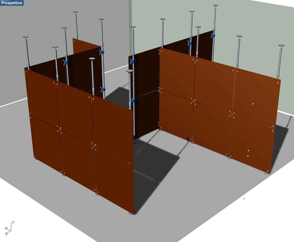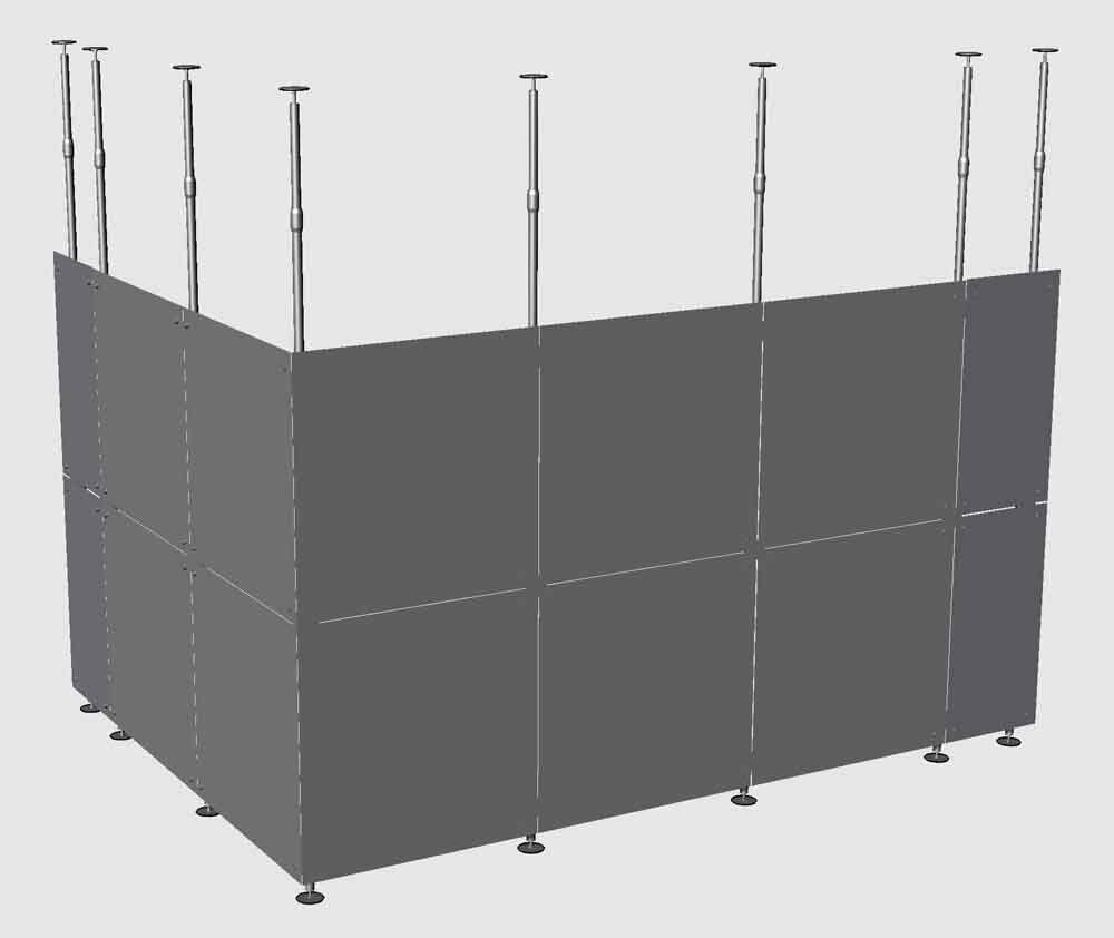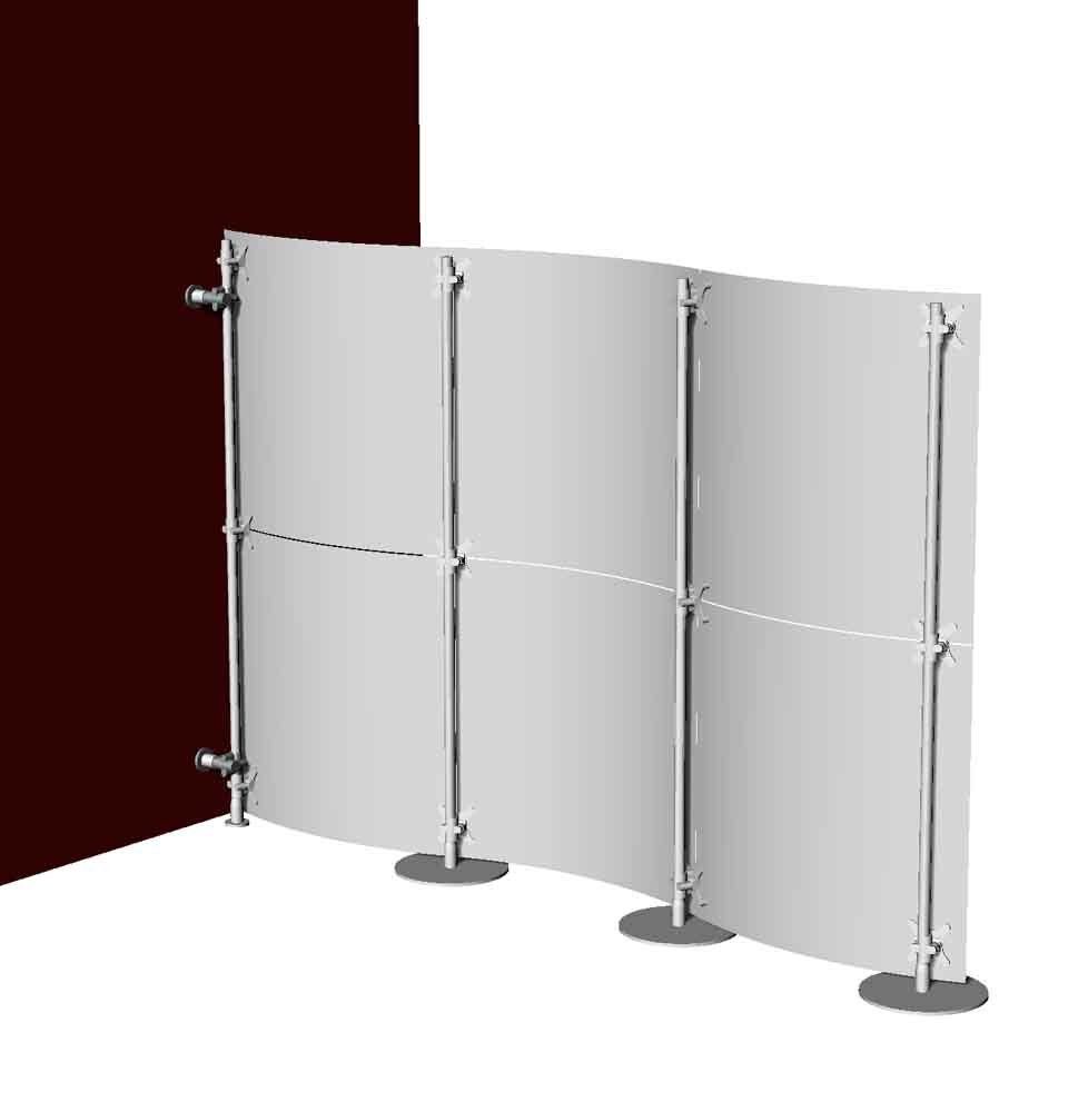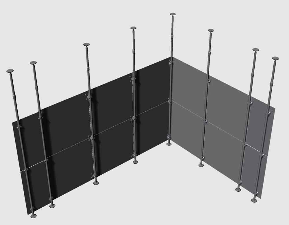 Los postes extensibles de los muros fijos están equipados con fijaciones para paneles de aluminio cromado y son adecuados para realizar tanto muros rectos como esquineros, pero también soluciones en forma de “T” o “X”.