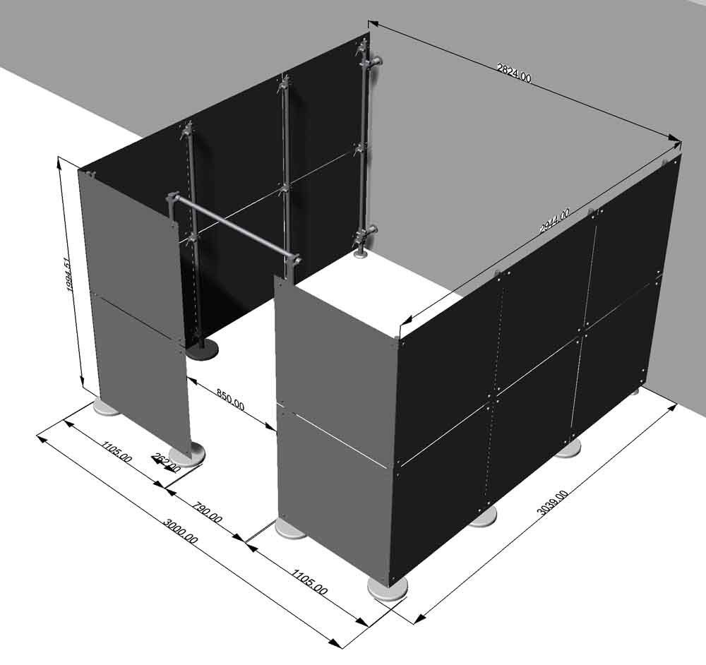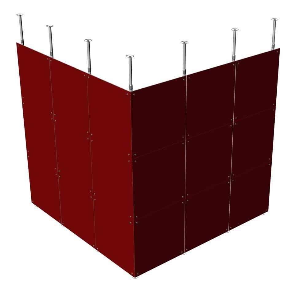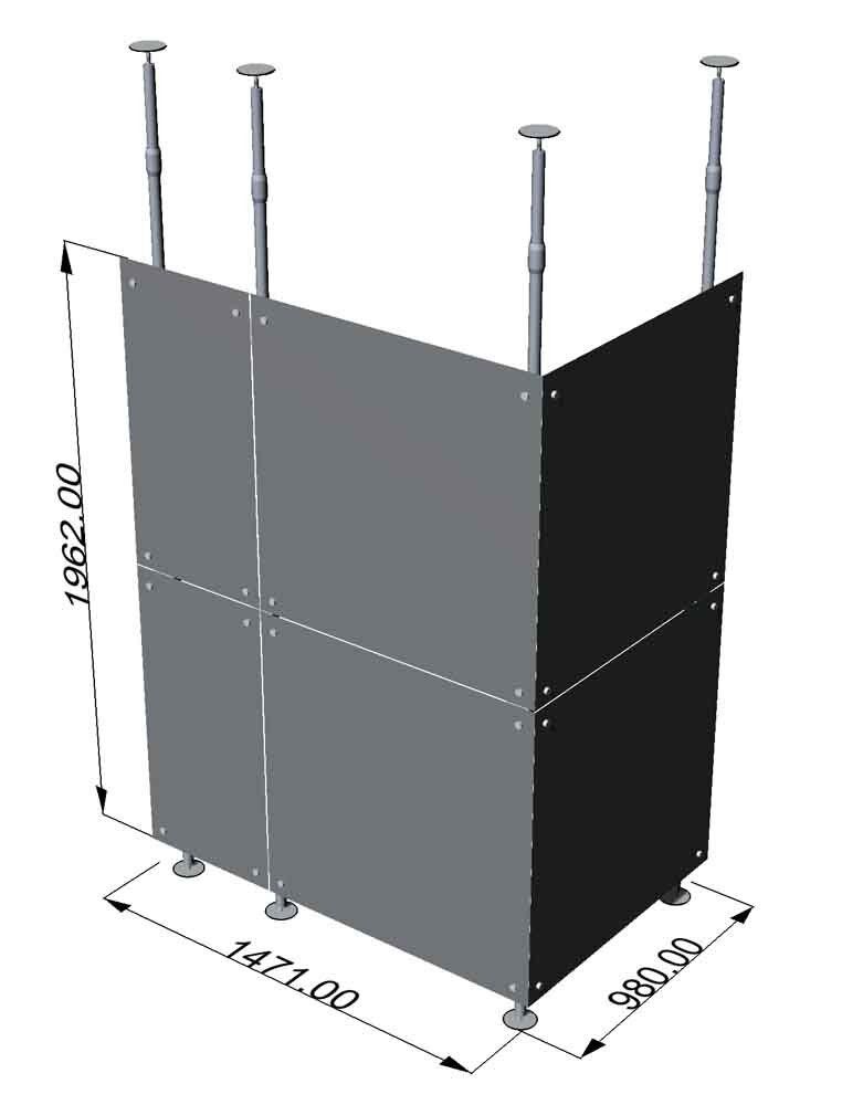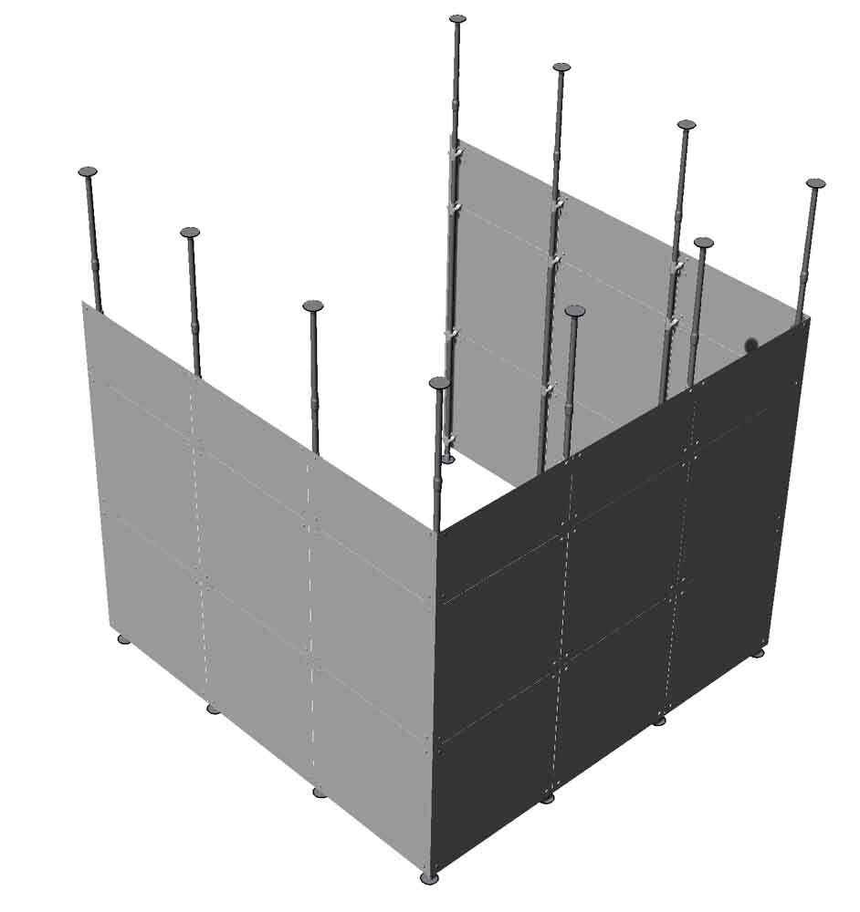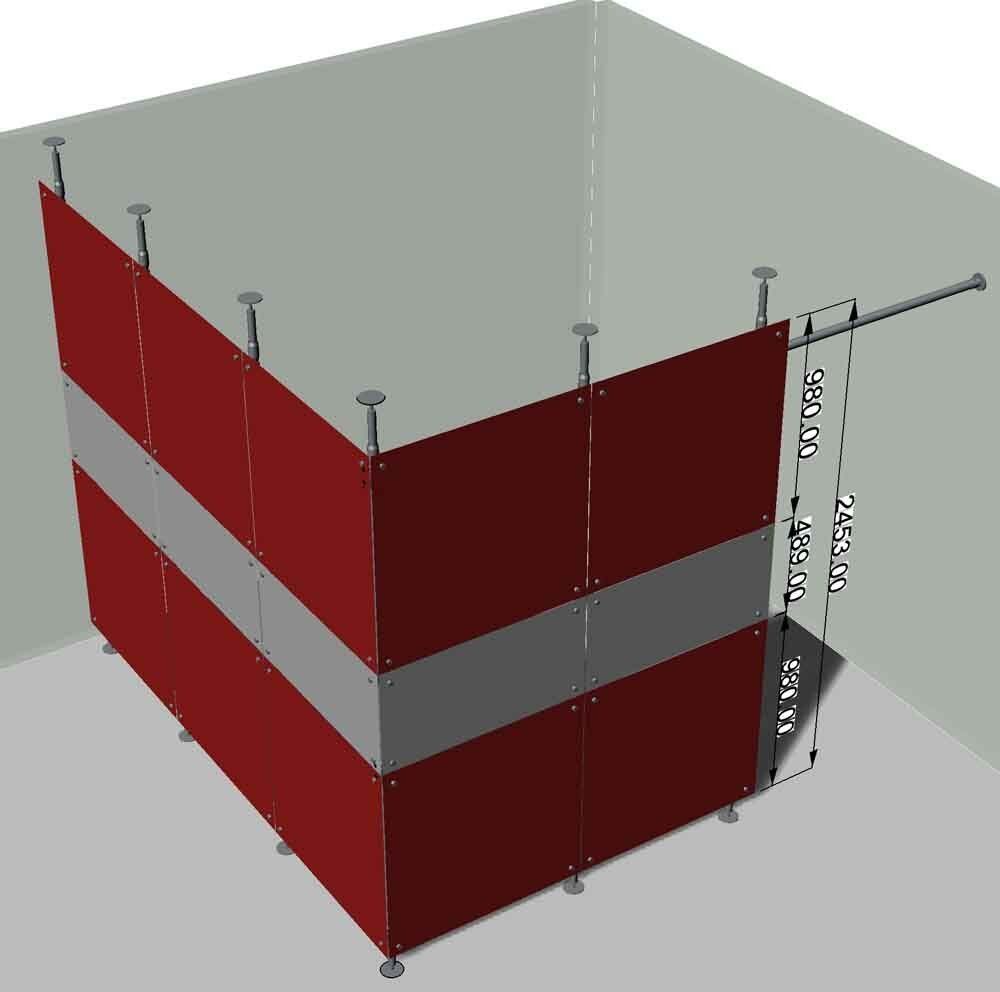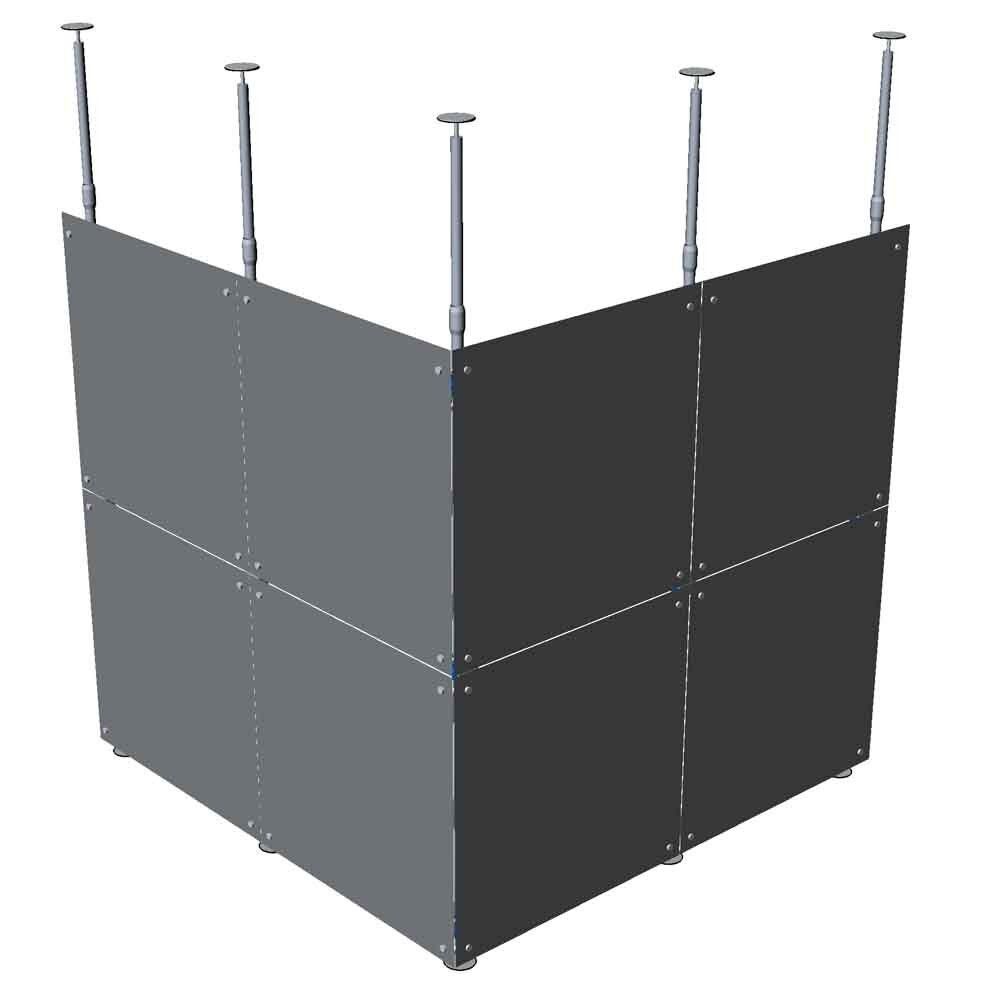 Los postes extensibles de los muros fijos están equipados con fijaciones para paneles de aluminio cromado y son adecuados para realizar tanto muros rectos como esquineros, pero también soluciones en forma de “T” o “X”.