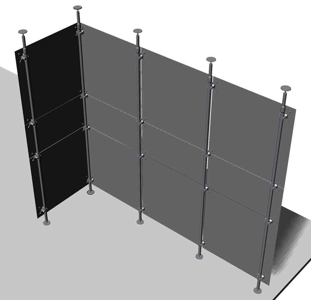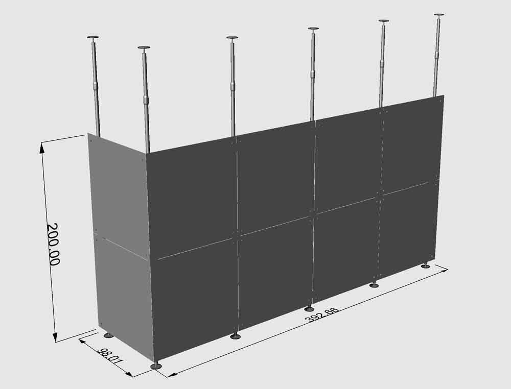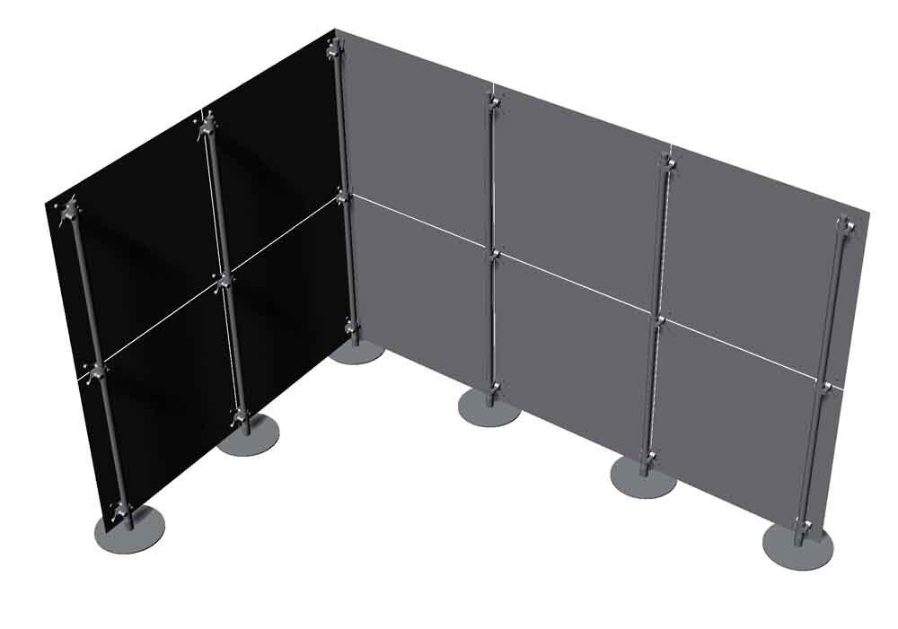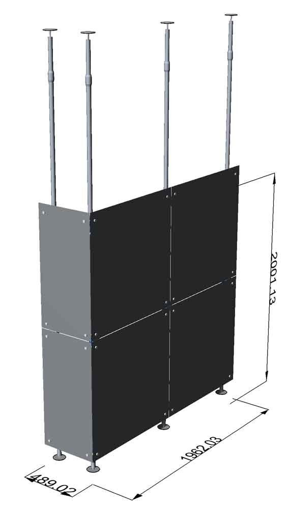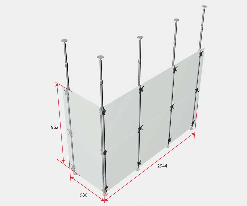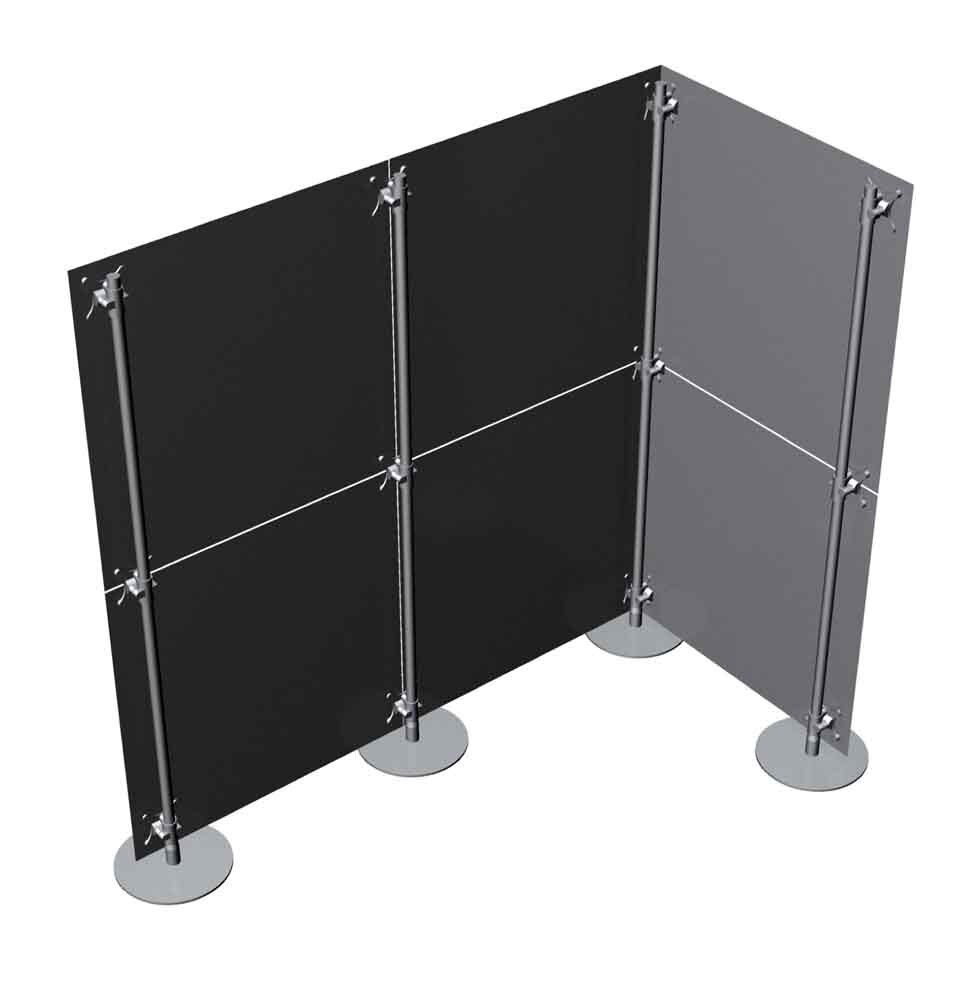- booths for aesthetics box temporary offices exhibition frames for negotiating reserved areas within open space offices (for example to screen the coffee area or printer area) to create temporary meeting rooms at the end of the room to obtain multiple workstations in small offices dimensions to shield the operational area from the sales area within craft workshops to create the storage / warehouse area within shops that are deprived of it to create a "room within the room" in open space premises to create self-supporting fences for display of large objects (cars, machinery, etc.)