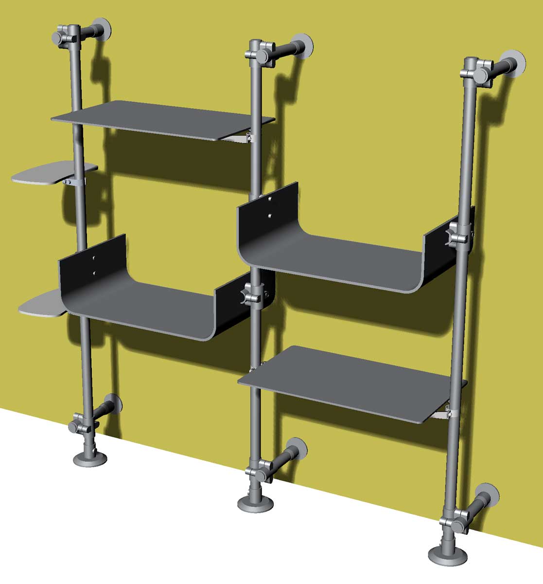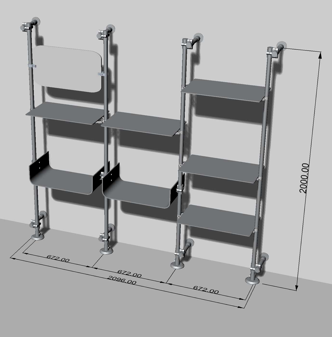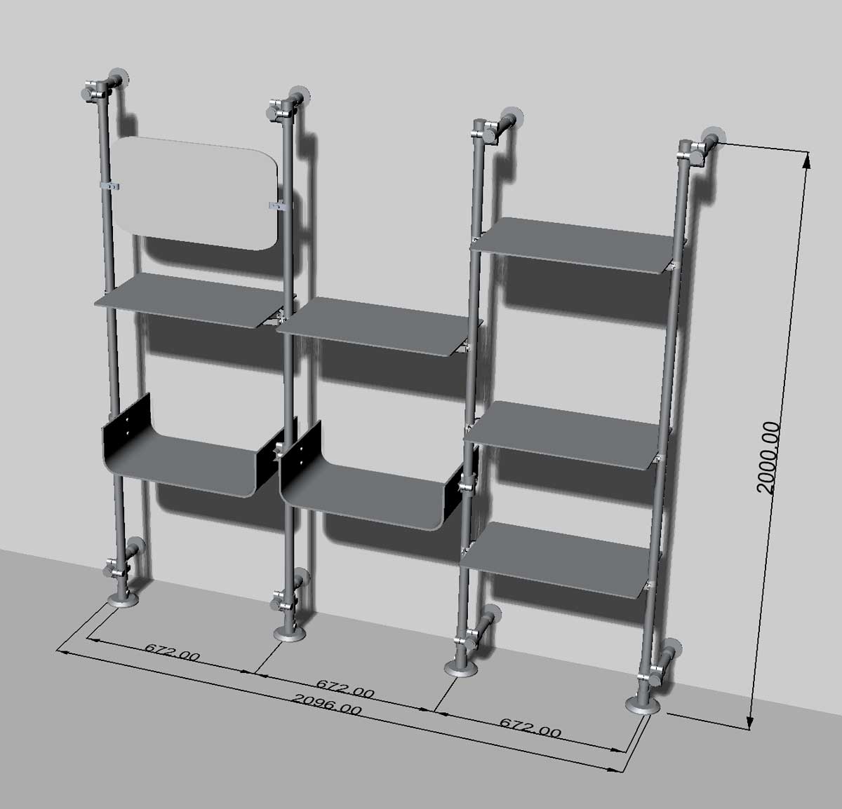 - uprights to be fixed to the wall: they are offered in standard heights of 200-210-250 cm but we can also supply uprights in customized height lower or higher. This fixing method allows to have furniture firmly anchored to the wall. The center distance between one upright and the next is 672 mm.
