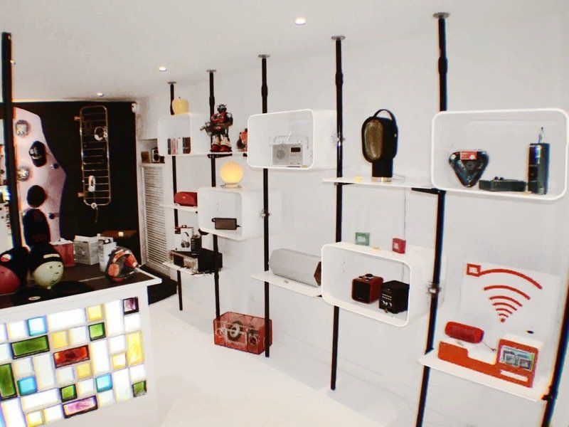Nell'ambiente principale le pareti sono attrezzate a mensole e ospitano varie tipologie di prodotti: vecchi giradischi si alternano a gadget vintage e accessori audio.